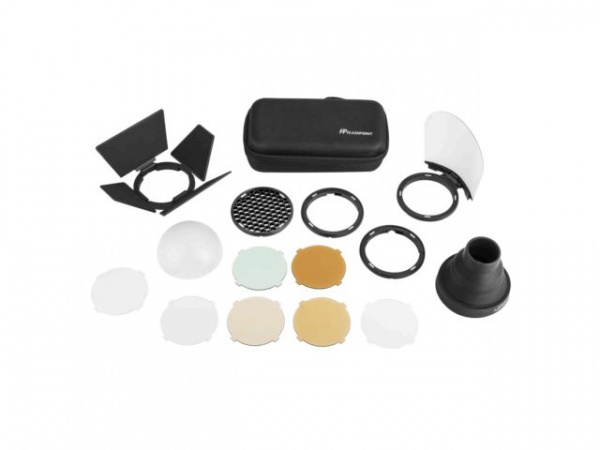 Kit comprenant : Dôme sphérique + Snoot caoutchouc repliable + Filtres CTO + Grille nid d'abeille + Coupe-flux + Lentille optique grand-angle + casquette blanche + Etui de rangement