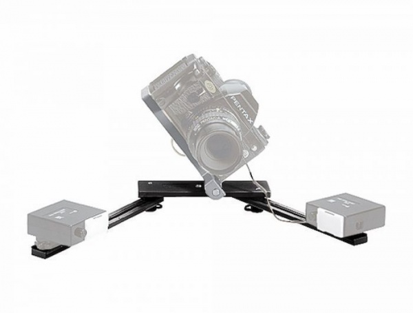 Permet de fixer 2 flashes et un appareil photo sur une rotule. Douilles femelles 3/8'' et 1/4''. Fabriqué en aluminium.