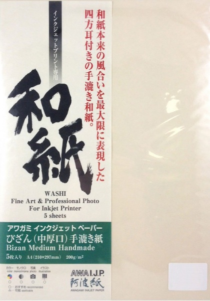 Bizan medium naturel 200 g/m² A4 5f: Le papier BIZAN est fabriqué entièrement à la main avec un procédé traditionnel. Ce papier luxueux a une épaisseur généreuse et ses quatre bords sont frangés. Grâce à sa rigidité, les images imprimées sur ce papier peuvent être exposées sans encadrement.