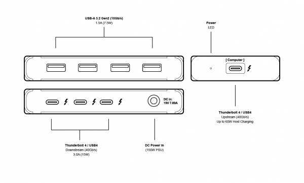 Jusqu'à 60W de charge d'hôte (5V/3A, 9V/3A, 15V/3A et 20V/3A)Each Downstream Thunderbolt 4 / USB4 Port: 15W (5V/3A)
