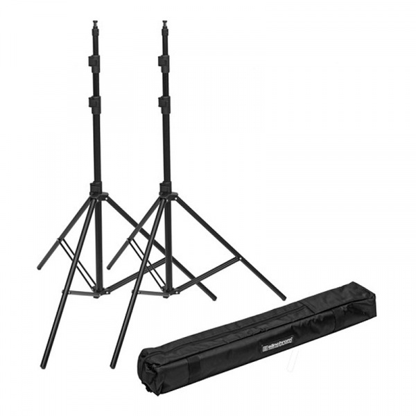 2 trépieds Elinchrom standard réf. ELI30101, hauteur max 2,35m, min 0,88ml, livrés avec un petit sac noir de transport de la marque.