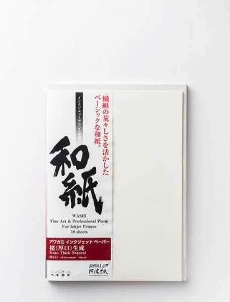 Kozo épais naturel 110 g/m² A2 10f: Le papier Kozo (« mûrier » en japonais) est fabriqué avec des fibres de mûrier de la région de Tokushima. Il est connu pour sa résistance et sa durabilité. Couchage épais 110 g/m² en teinte naturelle. Il peut être utilisé pour du tirage photographique ou pour de la reproduction haut de gamme d’oeuvres d’art.
