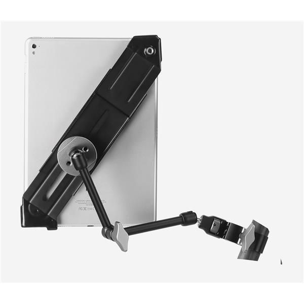 La tablette se positionne dans la pince en diagonale. Celle-ci s’ajuste de 340 mm à un maximum de 500 mm pour accueillir plusieurs tailles d’appareils. Il est usiné par ordinateur et entièrement fabriqué en aluminium aéronautique anodisé noir : il est aussi solide que léger ! Trois caoutchoucs sont placés sur la longueur de l'IPC-500 pour que votre iPad n'entre pas en contact direct avec l'aluminium.