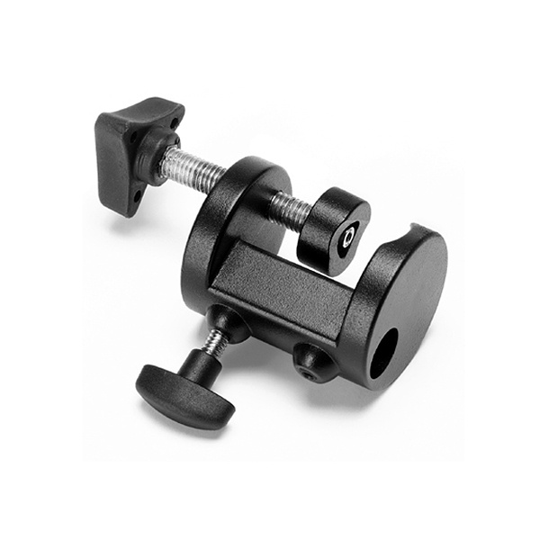 Petit clamp mais solide, qui se fixe à la plupart des pieds d’éclairage, trépieds et supports de fond. La mâchoire s’ouvre sur 3cm (1,1''). Permet notamment de fixer des torches ou des boîtiers.