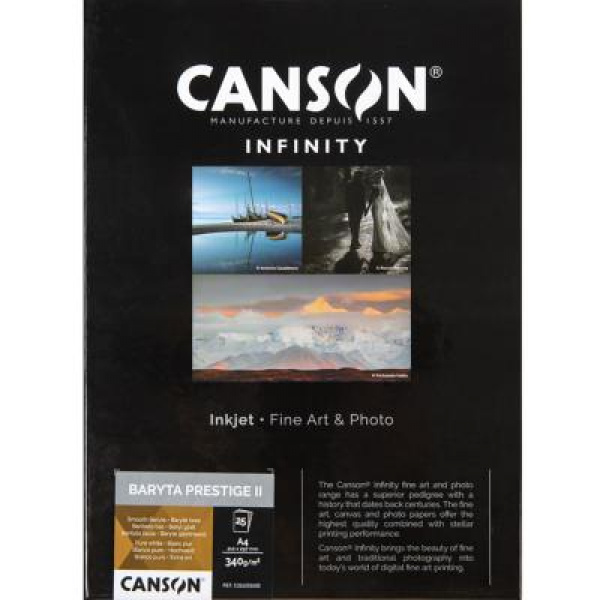 Canson® Infinity Baryta Prestige 340 g/m² est composé d'alpha-cellulose sans acide et d'une base en papier blanc coton, avec une pellicule en sulfate de baryum véritable. Ce papier baryté doux et brillant évoque l'aspect et l'esthétique des papiers argentiques traditionnels.
