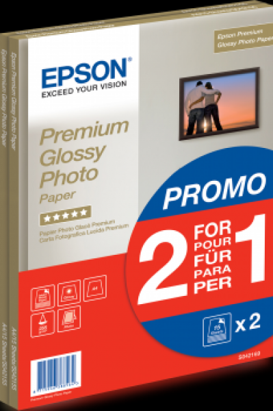 Support jet d'encre Premium Glossy format A4 - 21x29,7cm, conditionné en pack promo de 2x 15 feuilles.