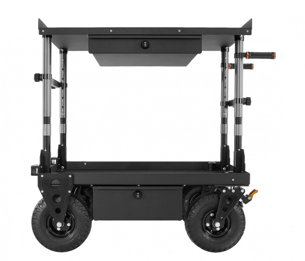 Poste de travail ambulant idéal pour les DIT, les techniciens numériques et les photographes. L'étagère supérieure a un côté sans rebord pour l'utilisation avec un clavier. Le chariot Echo utilise notre conception brevetée de pliage sans outil et est équipé de notre tablette supérieure verrouillable et réglable en hauteur.