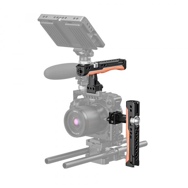 La poignée rotative Nato Clamp HTN2362 de SmallRig est conçue pour offrir une utilisation confortable à la main et des filetages de montage pour des accessoires tels que le moniteur, et la lumière.