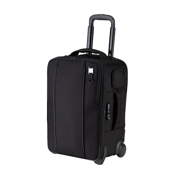 Comprend le module d'objectif amovible exclusif de Tenba, une pochette arrière pour batterie mobile et un support pour trépied à accès rapide, ainsi qu'un câble de sécurité en acier, des fermetures éclair intégrées, des poignées garnies de cuir et des roues amortissantes.